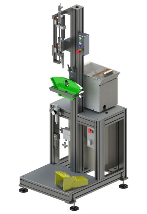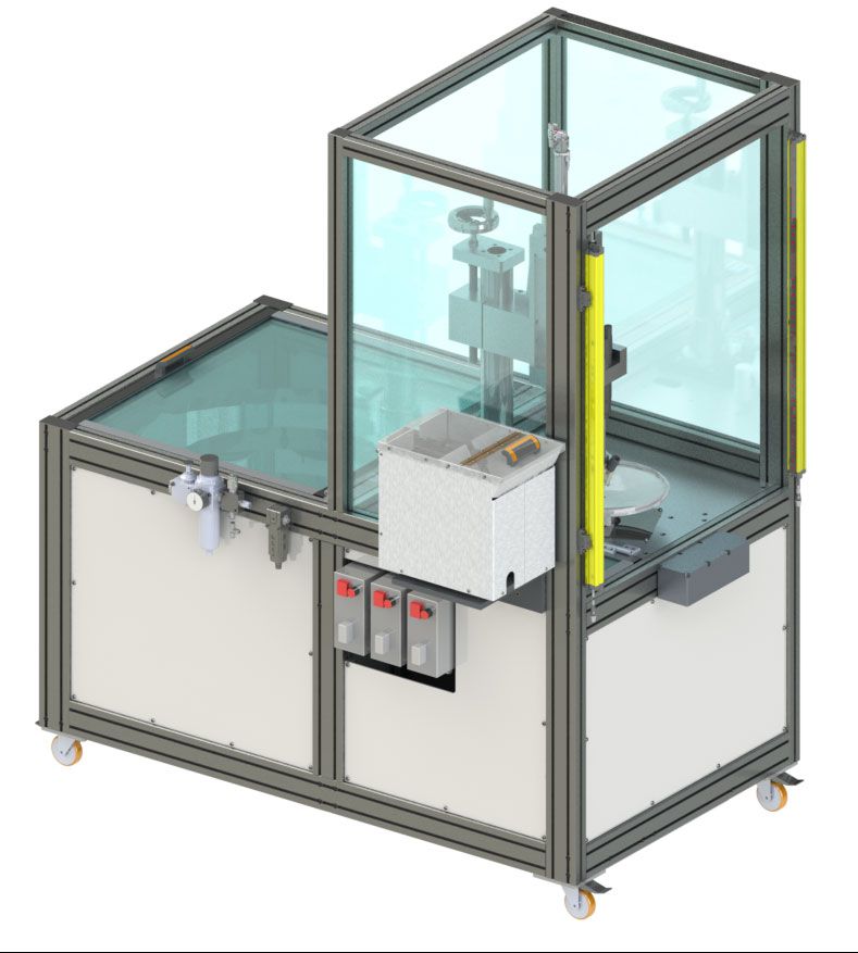 Banco di avvitatura verticale semiautomatico per l’avvitatura del pomolo con il coperchio. La selezione della vite che li unisce è eseguita in automatico tramite un selezionatore, mentre la selezione del pomolo può essere sia automatica sia manuale, a seconda delle esigenze del cliente. Nel caso in cui la selezione del pomolo sia automatica, l’operatore provvede a posizionare il coperchio e, tramite un pedale, dà il consenso per l’esecuzione del ciclo di avvitatura. La regolazione del coperchio è universale e può essere regolata in altezza e ampiezza a seconda del diametro del coperchio. La macchina è dotata di ripari fissi e di barriere fotoelettriche, nel rispetto delle norme di sicurezza vigenti.